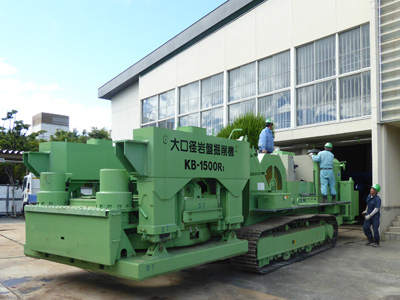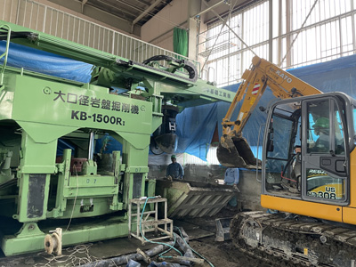 低空頭スライド工法では壁を壊すことなく掘削機が自走で建築物内に進入し、屋内で工事をすることが可能です。